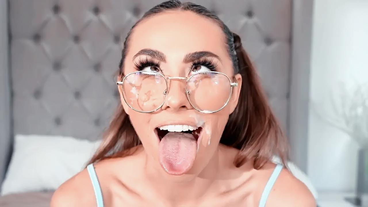 With her glasses still on, she turns around to face him and he pounds her pussy with all his force. Naked slut experiences one orgasm after another making ahegao faces, and then he penetrates her tight butt hole. He slams her sideways, allowing her to rub her clit while he thrusts into her. He pulls out and sprays her bald pussy with his jizz.
