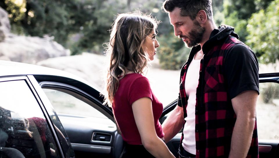 Kristen Scott's desire to have a ride fades away as soon as she sees a firearm in Mike Mancini's glove compartment. The frightened chick keeps acting as if nothing has happened and tries to distract dangerous man's attention by XXX blowing.