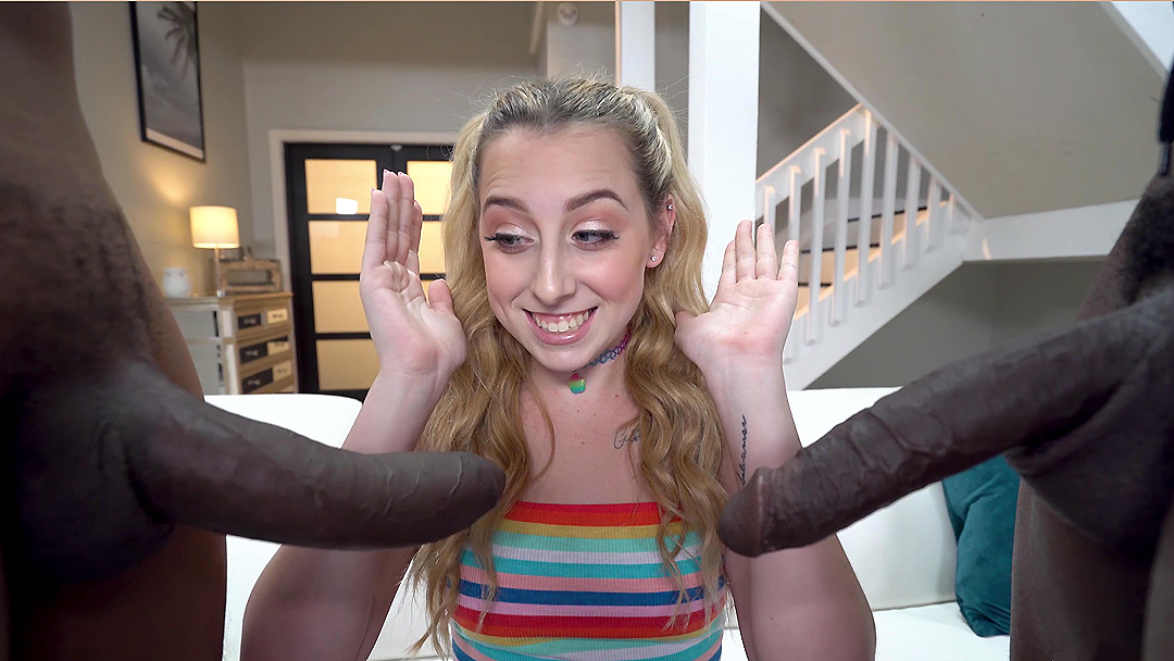 Adorable skinny blonde Melody Parker shakes her small ass for Ebony guy and then tastes their enormous boners in threesome. Young chick blows these huge peckers taking them deep into throat with mich spit.