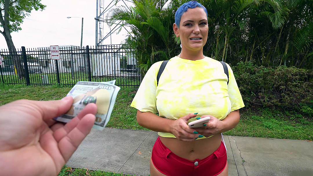 Guys are driving through city streets when they discover blue-haired bombshell walking along the road. They stop by and one of them starts talking to her. Turns out gal with short hair doesn't mind demonstrating her big XXX ass in exchange for money.